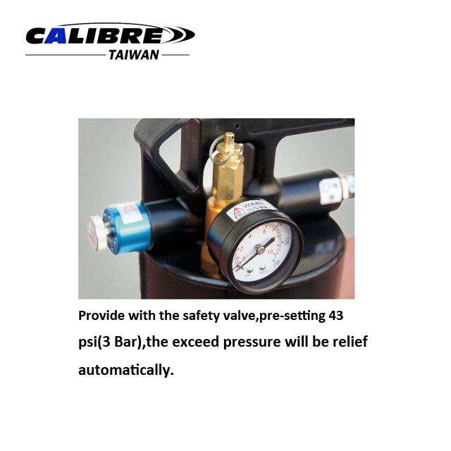 Características: | * Usar para extraer, transferir y dispensar fluido de forma rápida, segura y limpia. * Sin chispas, un hombre en el mismo paso funciona. * Equipado con la válvula de seguridad, preajuste de 43 psi (3 Bar), el exceso de presión se aliviará automáticamente. * Equipado con el manómetro, se puede leer y controlar la presión en el tanque más fácilmente. * Depósito de capacidad de 6L con guía de volumen. * Manguera de nailon X manguera de pu de 1M y 2 M con una pistola de control táctil para un fácil funcionamiento. * Adaptador táctil para transporte de aceite ATF. * Válvula de tornillo para facilitar el cambio de extracción o dispensación. * Válvula de control de alto flujo para extraer el fluido más rápidamente. * Material de cobre con un diseño de acoplador táctil para un funcionamiento fácil. * Mango de gatillo con bloqueo. * 8 piezas adaptador de transporte de un toque/funda de soplado * Entrada de aire 1/4" * Promedio Aire desventajas 2CFM * Presión de trabajo 90 Psi * Capacidad Máxima 6000cc |