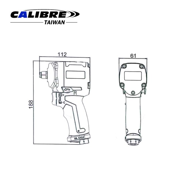 * Longitud: 112mm * Peso: 1,15 kg (2,5 libras) * Velocidad: 9500RPM * Par máximo a 90psi: 746 Nm (550 pies-lb). * Torque de trabajo a 90psi: 122-610 Nm (90-450 pies-lb) * Avg. Consumo de aire: 136 L/MIN (4,8 CFM) * Manguera mínima: 3/8” * Entrada de aire: 1/4”