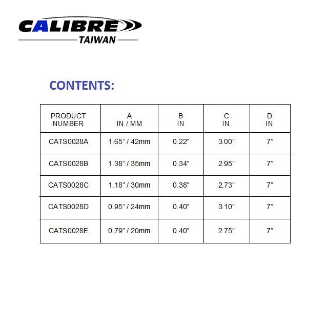 * NÚMERO DE PRODUCTO A B C D * CATS0028A: 1,65 ”/ 42mm 0,22” 3,00 ”7” * CATS0028B: 1,38 ”/ 35mm 0,34” 2,95 ”7” * CATS0028C: 1,18 ”/ 30mm 0,38” 2,73 ”7” * CATS0028D: 0,95 ”/ 24mm 0,40” 3,10 ”7” * CATS0028E: 0,79 ”/ 20mm 0,40” 2,75 ”7”